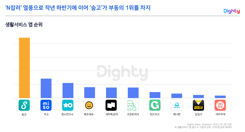 최근 N잡러 열풍에 업무 환경 변화 및 상반기 코로나 19 격리자 증가 영향이 더해지며 다양한 생활 플랫폼의 수요도 늘어났다. 전문가 재능 매칭 플랫폼 ‘숨고’는 생활 서비스 설치 수 1위를 차지하며, N잡러의 기회를 실현시켜주는 재능 부업 플랫폼으로 자리매김했다. 또한 심부름 앱 ‘해주세요’는 설치 수가 157% 급증했으며, 비대면 세탁 앱 ‘세탁특공대’와 ‘런드리고’도 각각 45%, 41% 증가했다.