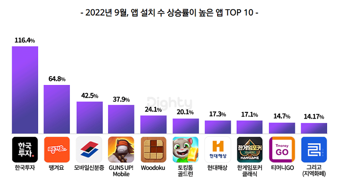 약 2천8백만 안드로이드 유저의 앱 설치 빅데이터를 바탕으로 9월 첫째 주(9/5 기준)와 8월 첫째 주(8/9 기준) 사이의 설치 수 증가 추이를 분석한 결과, 기존 서비스를 종료하고 신규 서비스를 선보인 ‘한국투자’ 앱이 116.4%로 증가율 1위를 기록했다. 이어서 ‘땡겨요(64.8%)’, ‘모바일신분증(42.5%)’, ‘건즈업!모바일(37.9%)’ 등이 상위권을 차지했다.