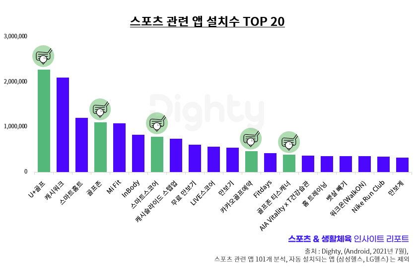 최근 젊은 세대의 유입 등으로 골프 시장과 플랫폼이 호황을 이어가고 있는 가운데, 골프 인구는 여전히 중장년층 남성의 비중이 높은 것으로 확인됐다. 7월 기준 스포츠 관련 앱 중 설치 수가 가장 많은 앱은 골프 서비스 플랫폼 ‘U+골프’였다.