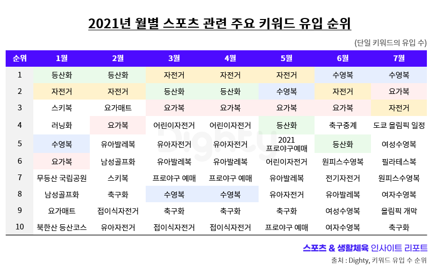 키워드 유입 데이터는 ‘다이티’ 고객사 웹사이트의 방문자가 어떤 단어를 검색해 유입됐는지 파악할 수 있는 데이터다. 계절에 따라 키워드 검색량 차이가 큰 다른 스포츠들과 달리, ‘자전거’는 올 상반기 매월 스포츠 관련 키워드 유입 수 순위 1~2위를 유지했다. ‘자전거’의 뒤를 이어 '수영복', ‘요가복', '등산화’ 순으로 키워드 유입 수가 많았다.