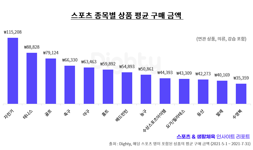 소비자들이 가장 많이 지갑을 여는 스포츠도 자전거로 나타났다. 용품, 의류, 강습 등 관련 상품의 평균 구매 금액이 가장 높은 종목은 자전거로, 소비자들은 자전거 관련 상품을 구매하는 데 평균 11만5,000원을 지불하는 것으로 집계됐다. ‘테니스’가 8만8,000원, ‘골프’가 7만9,000원으로 뒤를 이었다.