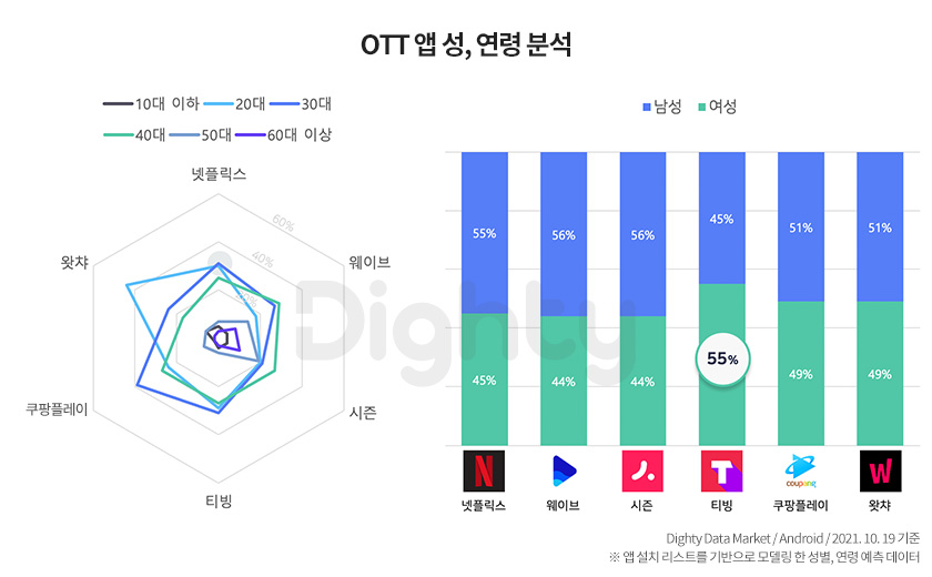 약 2,800만 개 ADID(안드로이드 기준)를 대상으로 데이터를 추출해 분석한 결과다. 올 하반기에도 OTT 열풍은 계속됐다. 앱 설치 수 1위 ‘넷플릭스’는 하반기(10월)에도 상반기(4월) 대비 설치 수가 8% 증가했다. 같은 기간 토종 OTT 서비스 ‘웨이브’는 12%, ‘티빙’은 23% 늘었다. ‘쿠팡플레이’는 147% 급증하며 서비스 출시 1년도 안돼 설치 수 순위에서 ‘왓챠’를 앞질렀다. OTT 앱 주이용자층은 2030세대로 나타난 가운데, ‘쿠팡플레이’는 30대 설치자가, ‘왓챠’는 20대 설치자가 가장 많았다. ‘넷플릭스’는 20대와 30대 비중이 유사하게 나타났다.