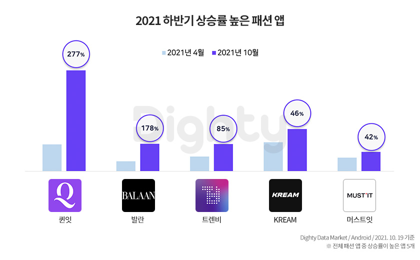 온라인 명품 플랫폼 3사의 앱은 설치 수가 일제히 큰 폭으로 증가하며 고성장세를 보였다. 증가율은 ‘발란’이 178%로 가장 높았으며, ‘트렌비’가 85%, ‘머스트잇’이 42%를 기록했다. 한정판 리셀 플랫폼 ‘크림’의 앱 설치 수도 46% 늘었다. 이들 명품·한정판 쇼핑 앱은 20대와 30대의 설치자 비중이 각각 37%, 32%로 집계됐다. 코로나 팬데믹 이후 MZ세대가 온라인을 기반으로 명품 및 한정판 시장의 주요 소비층으로 부상한 것으로 분석된다. 한편 4050 여성을 타겟으로 한 패션 앱 ‘퀸잇’은 차별화에 성공하며 앱 설치 수가 277% 급증해 눈길을 끌었다.