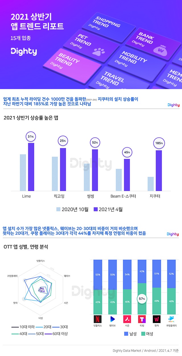 NHN DATA(대표 이진수)는 ‘다이티 데이터 마켓’을 통해 업종 별 앱 설치 데이터를 분석한 ‘2021년 상반기 앱 트렌드 리포트’를 발표했다고 24일 밝혔다. 리포트에는 총 15개 업종의 앱 설치 순위와 상승률, 성별·연령별 설치 비중 등이 공개됐다. 2020년 10월부터 2021년 4월까지 3,100만 개 모바일 기기(안드로이드 기준)를 대상으로 데이터를 추출해 분석한 결과다.