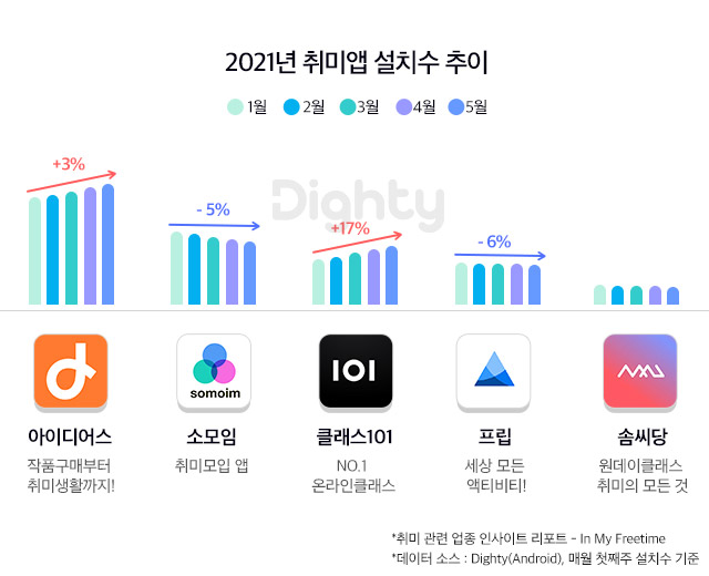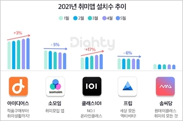 5월 기준 취미 키트와 온라인 클래스 상품을 판매하는 ‘아이디어스’ 앱 설치 수는 240만 건으로, 주요 독서 앱 설치 수보다 많았다. 독서 앱 설치 수는 ‘리디북스’가 86만 건으로 가장 많았으며, ‘밀리의 서재’, ‘윌라’, ‘예스24 eBook’ 순으로 집계됐다. 올 들어 온라인 강좌 플랫폼 ‘클래스101’의 앱 설치 수도 매월 증가해 5월 기준 연초 대비 17% 늘었다. 반면 오프라인 활동 비중이 큰 취미 공유 앱 ‘소모임’과 여가 액티비티 플랫폼 ‘프립’ 앱의 설치 수는 각각 5%, 6% 감소했다.